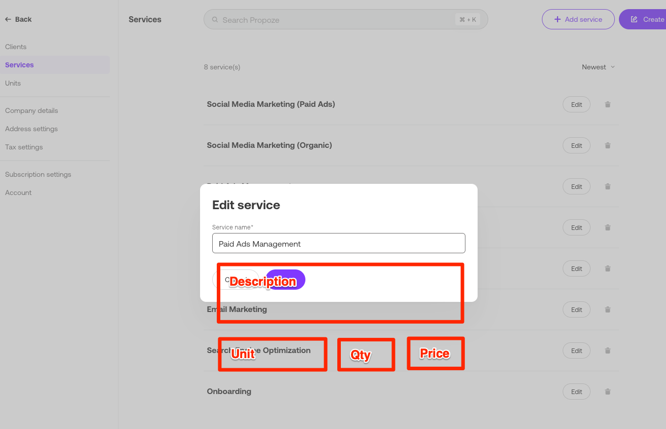 In the Services module, when creating or editing a service there should be additional fields available to enter the service description, units, and price for the service (ignore my field for QTY, that is not needed here).