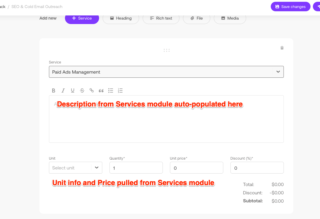 Any values entered here would be auto-populated when the service is added to a proposal. Users should still have the ability to edit details about the service as they are creating new proposals.